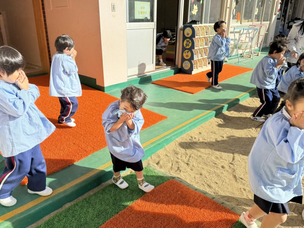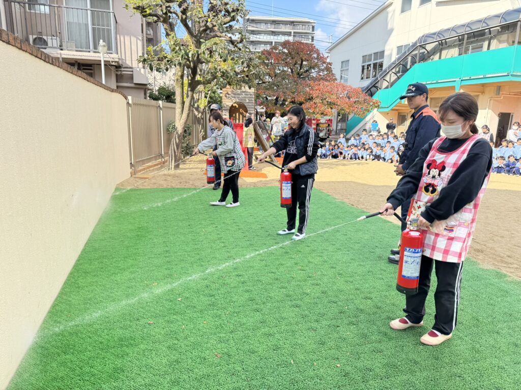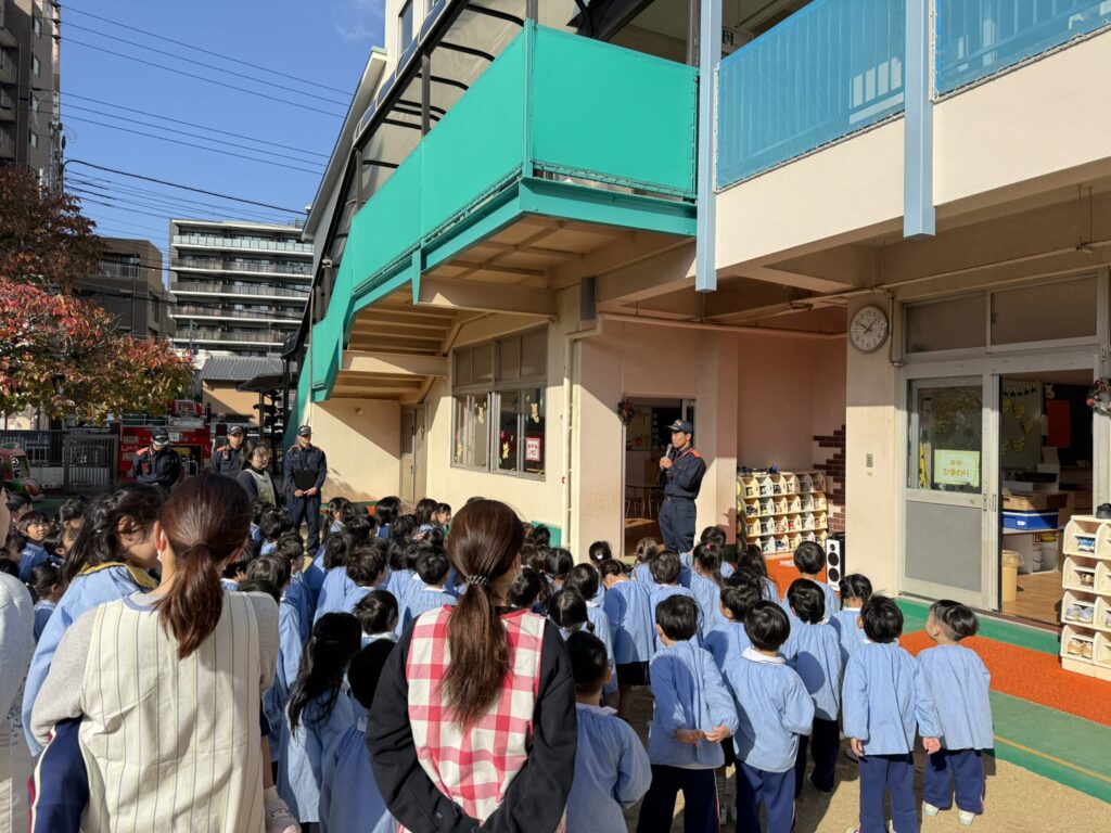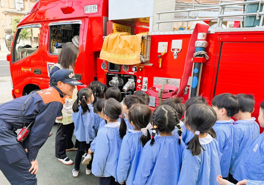 阿倍野消防署の消防士さんたちと一緒に、火災を想定した避難訓練を行いました。
